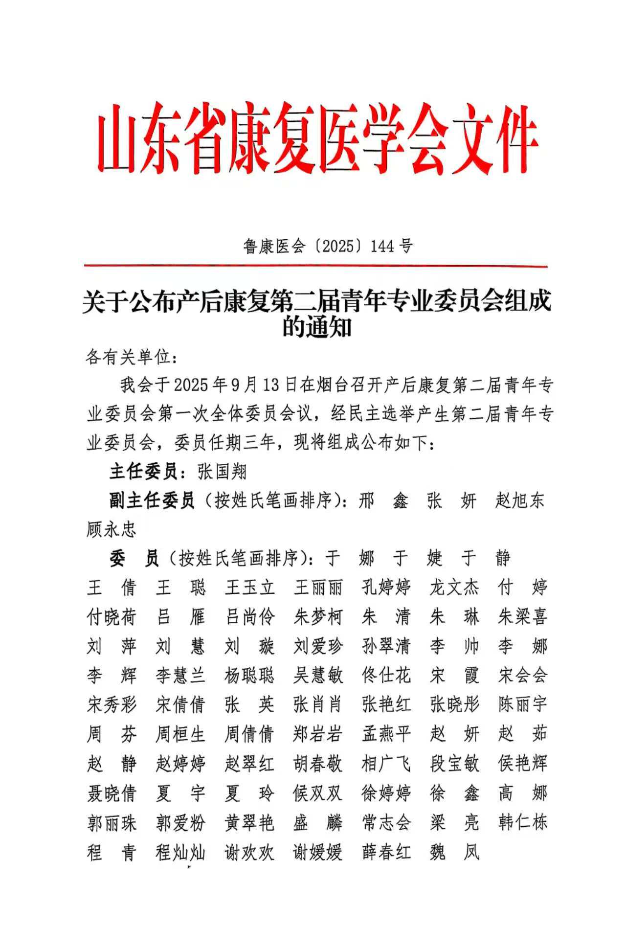山东省康复医学会关于产后康复第二届青年专业委员会组成的通知.pdf