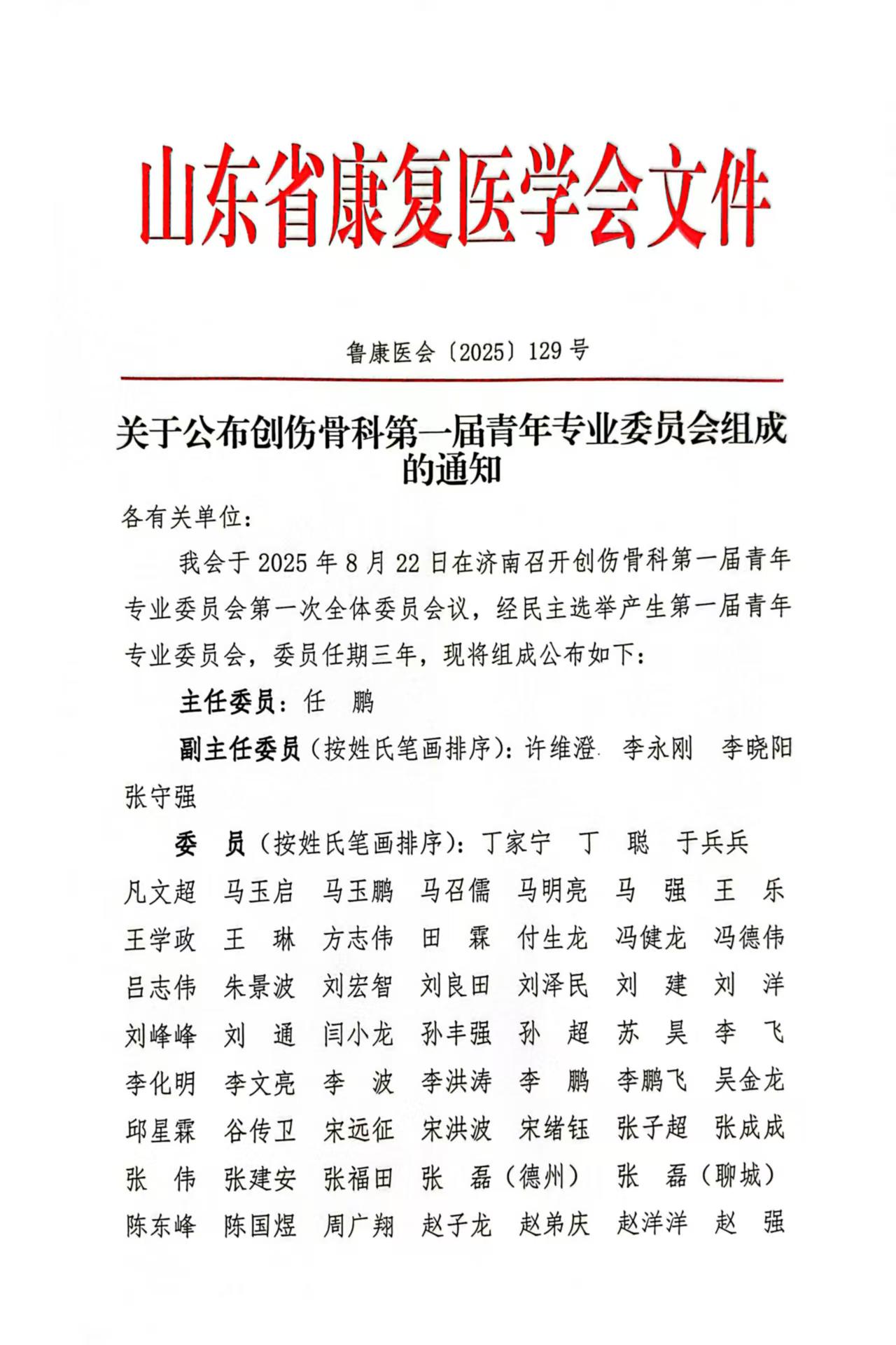 山东省康复医学会关于公布创伤骨科第一届青年专业委员会组成的通知.pdf