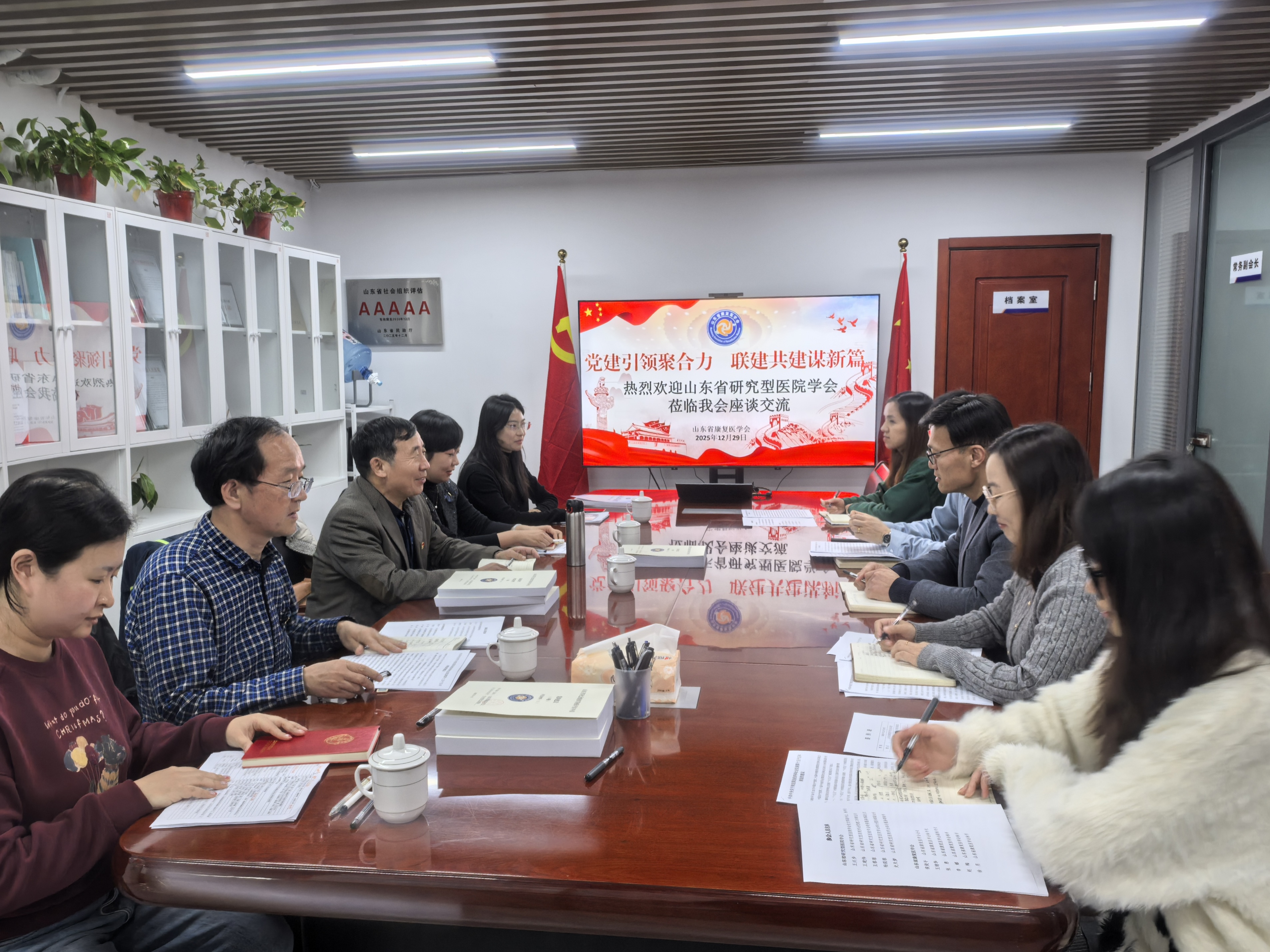 为强化党建引领,深化交流共建,12月29日,山东省研究型医院学会党支部副书记、秘书长王兴步一行5人赴我会联合开展专题学习座谈交流活动。山东省康复医学会秘书长王绪华主持座谈会。