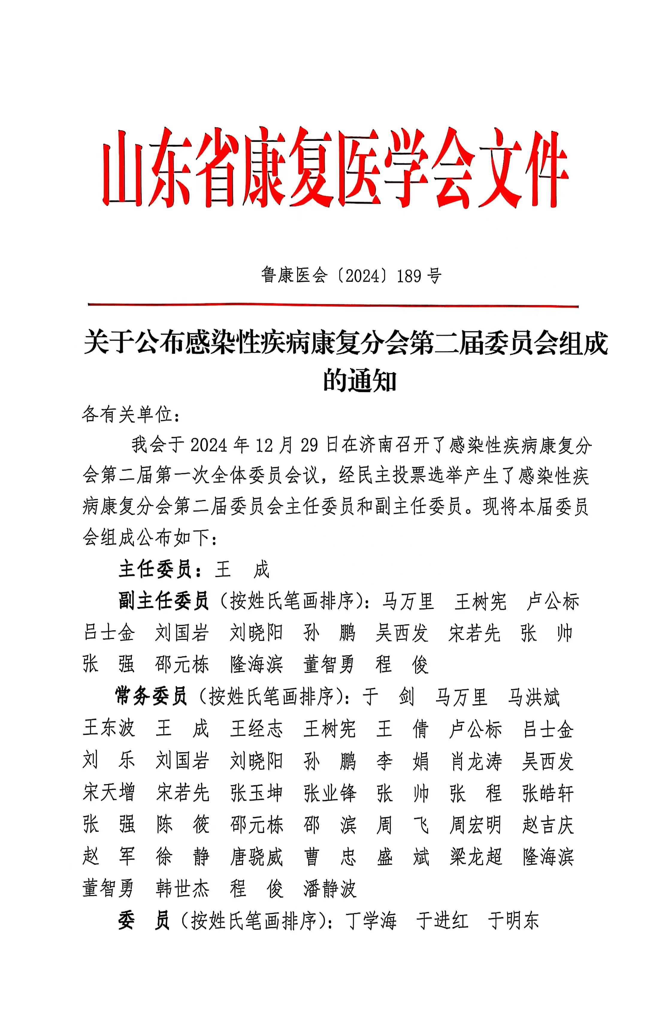 189-山东省康复医学会关于公布感染性疾病康复分会第二届委员会组成的通知.pdf