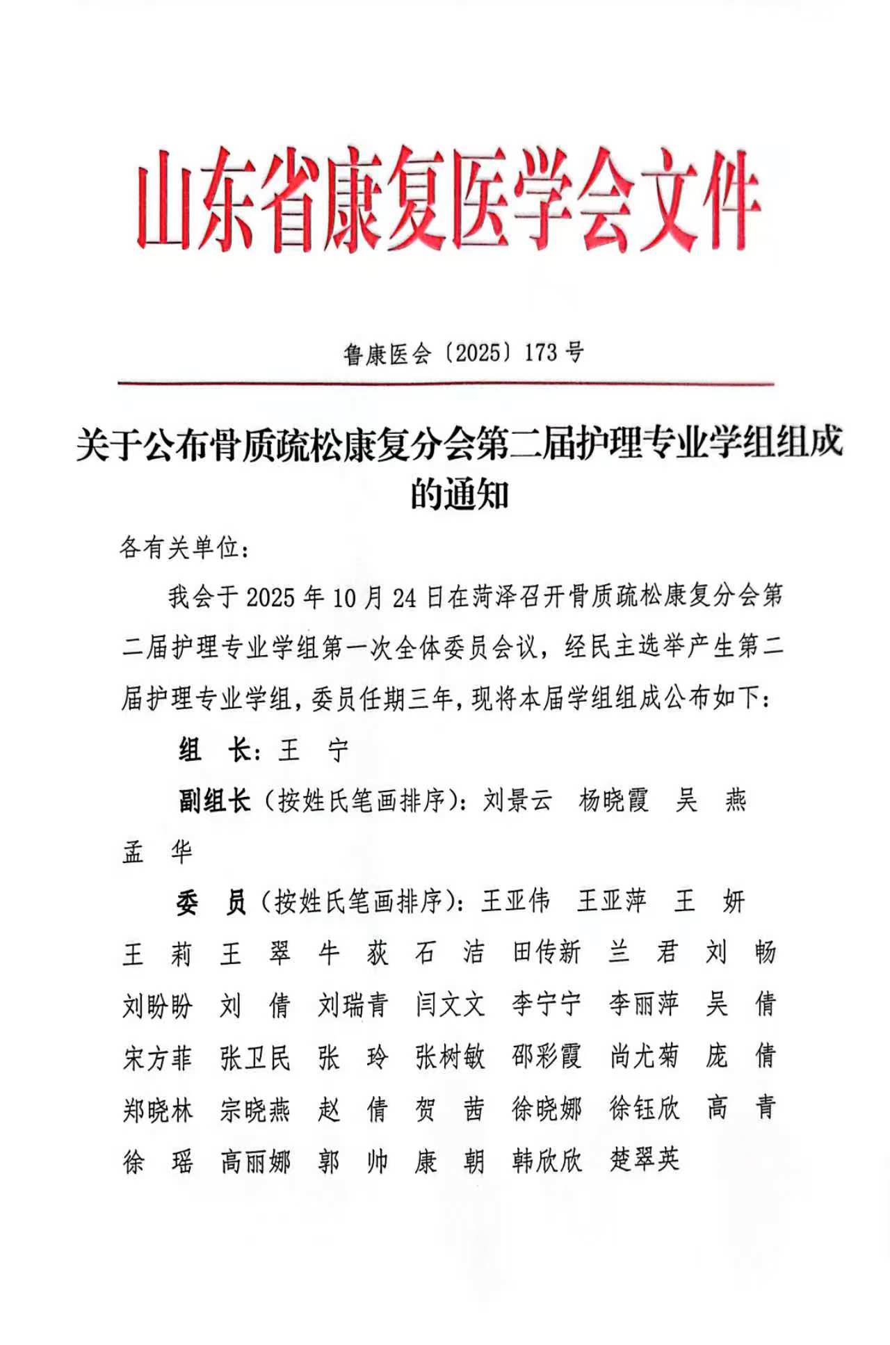 山东省康复医学会关于公布骨质疏松康复分会第二届护理专业学组组成的通知.pdf
