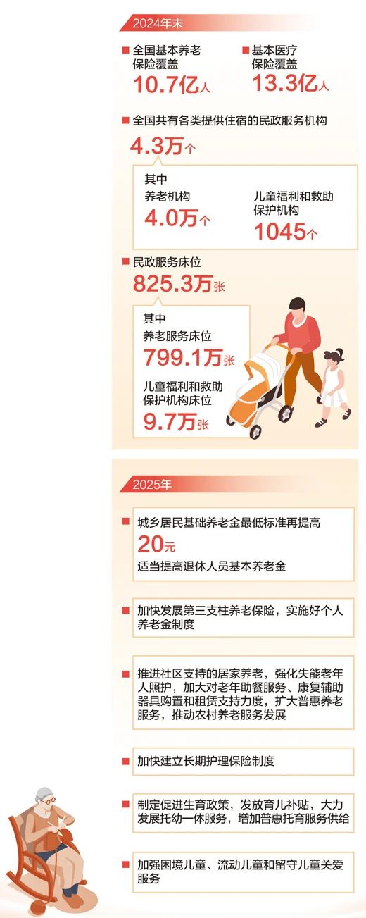 “一老一小”关乎民生、连着民心。2019年—2024年,全国财政用于养老服务和老年人福利方面的支出超过5600亿元,年均增长11%。目前,全国提供托育服务的机构已近10万个,托位约480万个。“一老一小”服务网织密织牢,托住稳稳幸福。