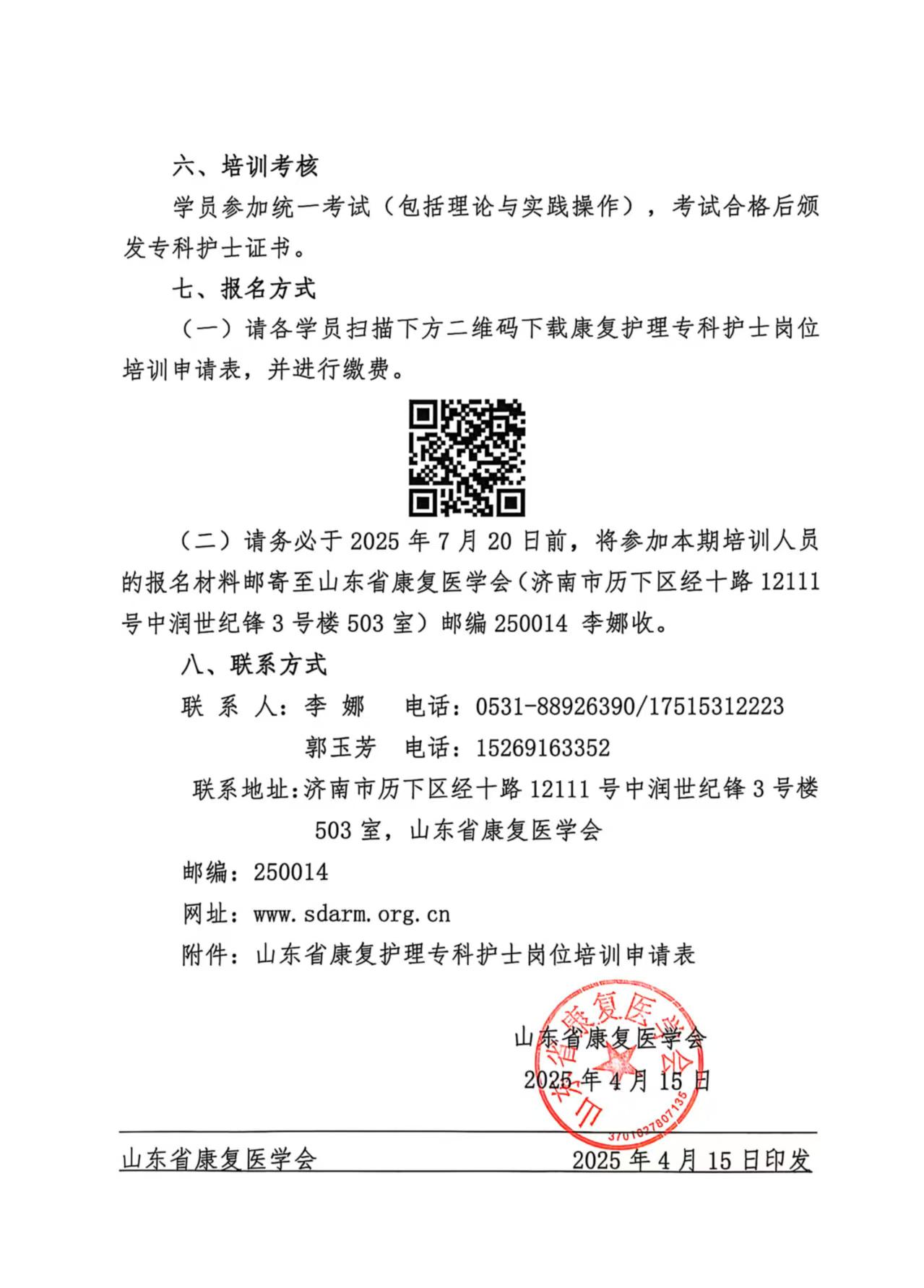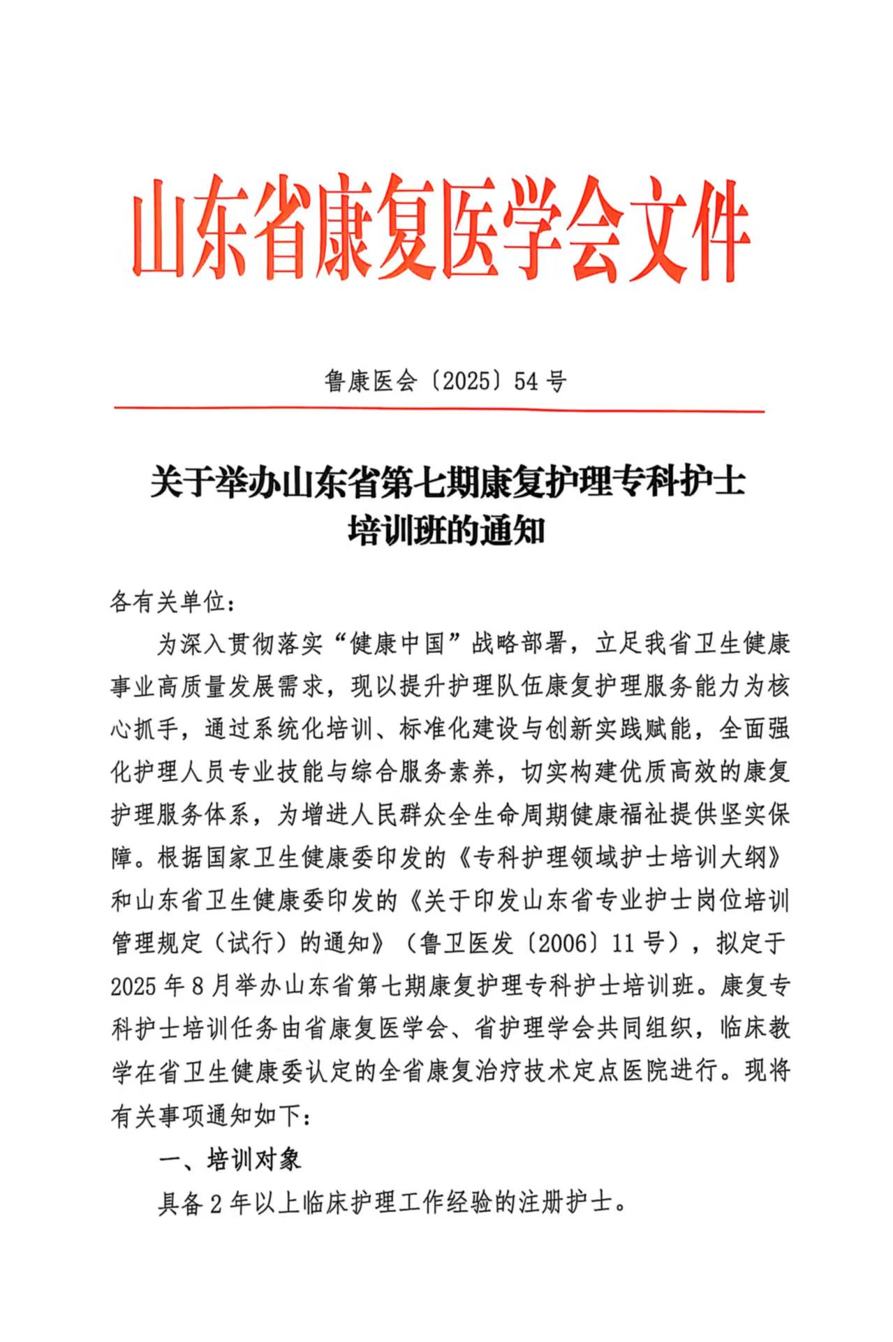 关于举办山东省第七期康复护理专科护士培训班的通知