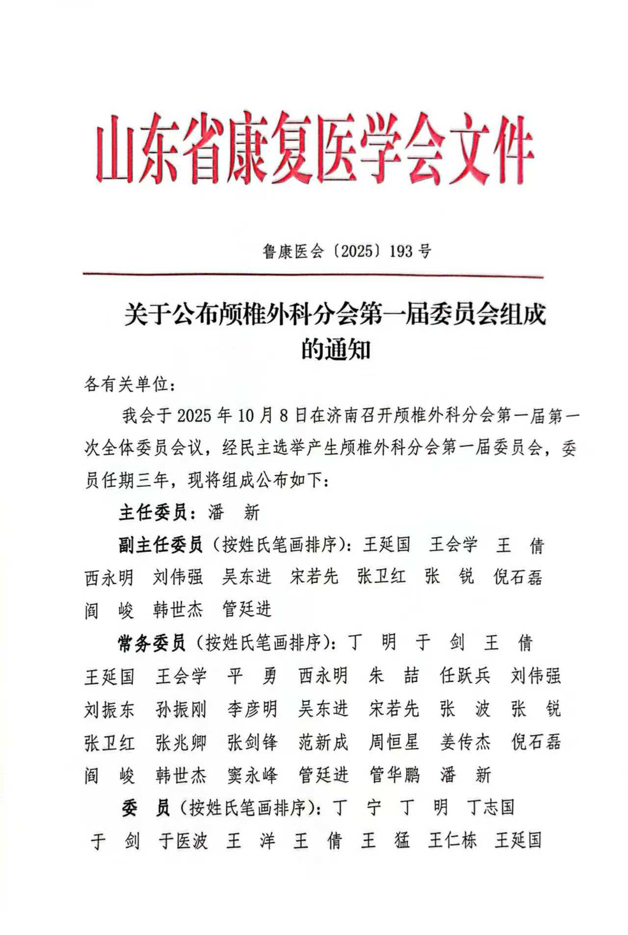 山东省康复医学会关于公布颅椎外科分会第一届委员会组成的通知.pdf