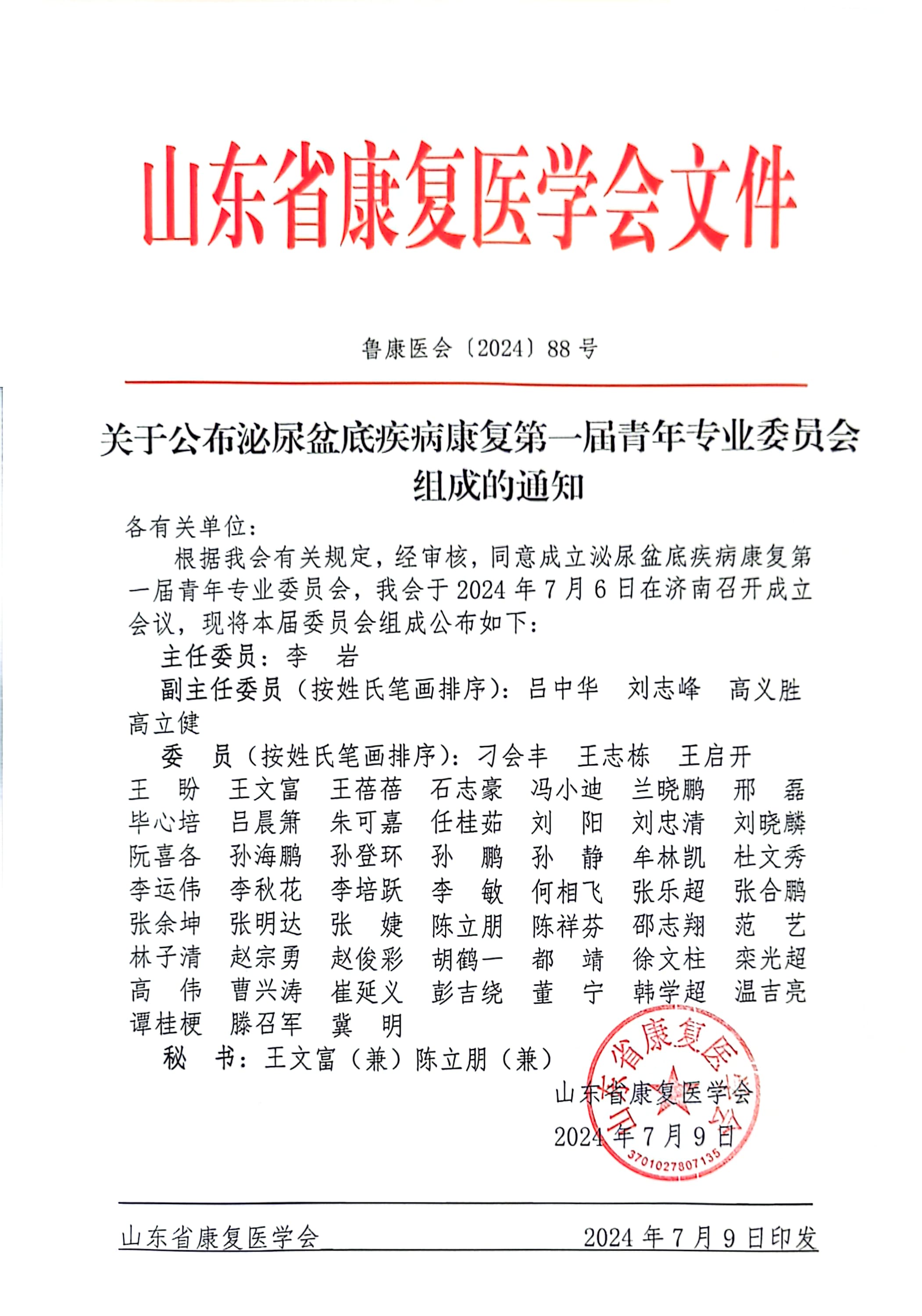 关于公布泌尿盆底疾病康复第一届青年专业委员会组成的通知