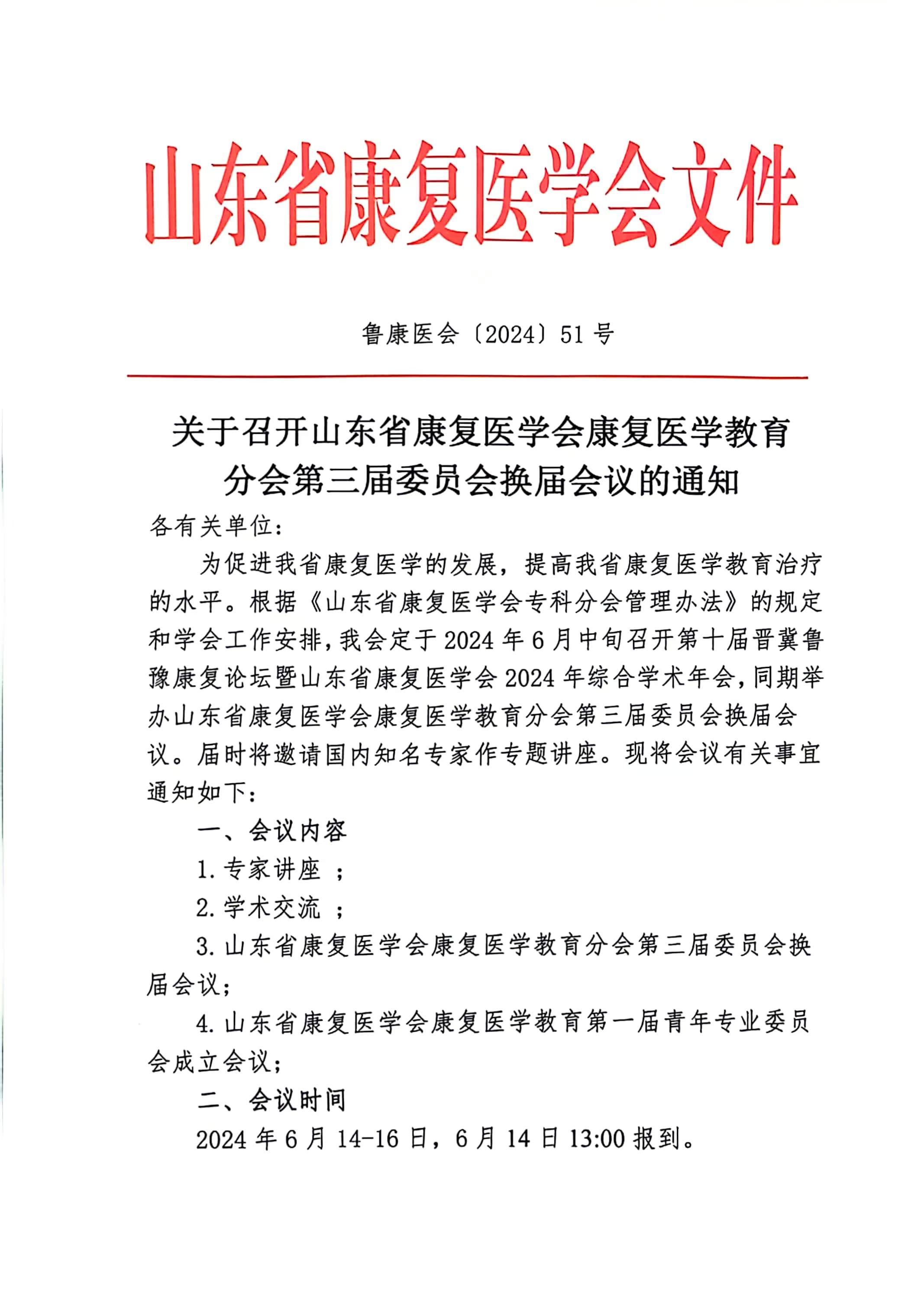 关于召开山东省康复医学会康复医学教育分会第三届委员会换届会议的通知