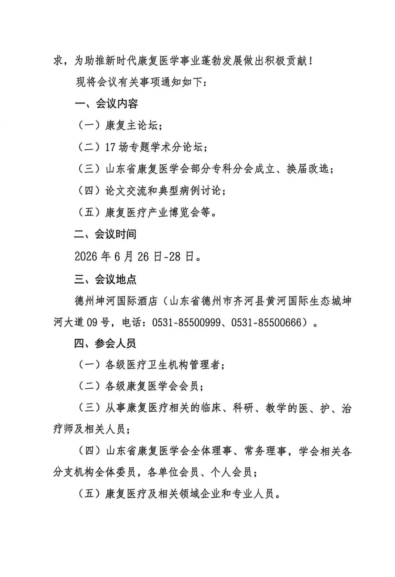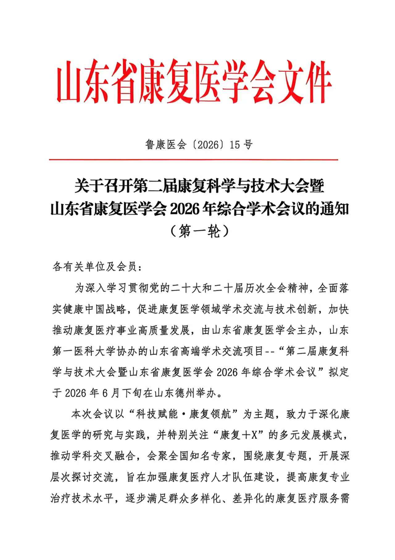关于召开第二届康复科学与技术大会暨山东省康复医学会2026年综合学术会议的通知(第一轮)