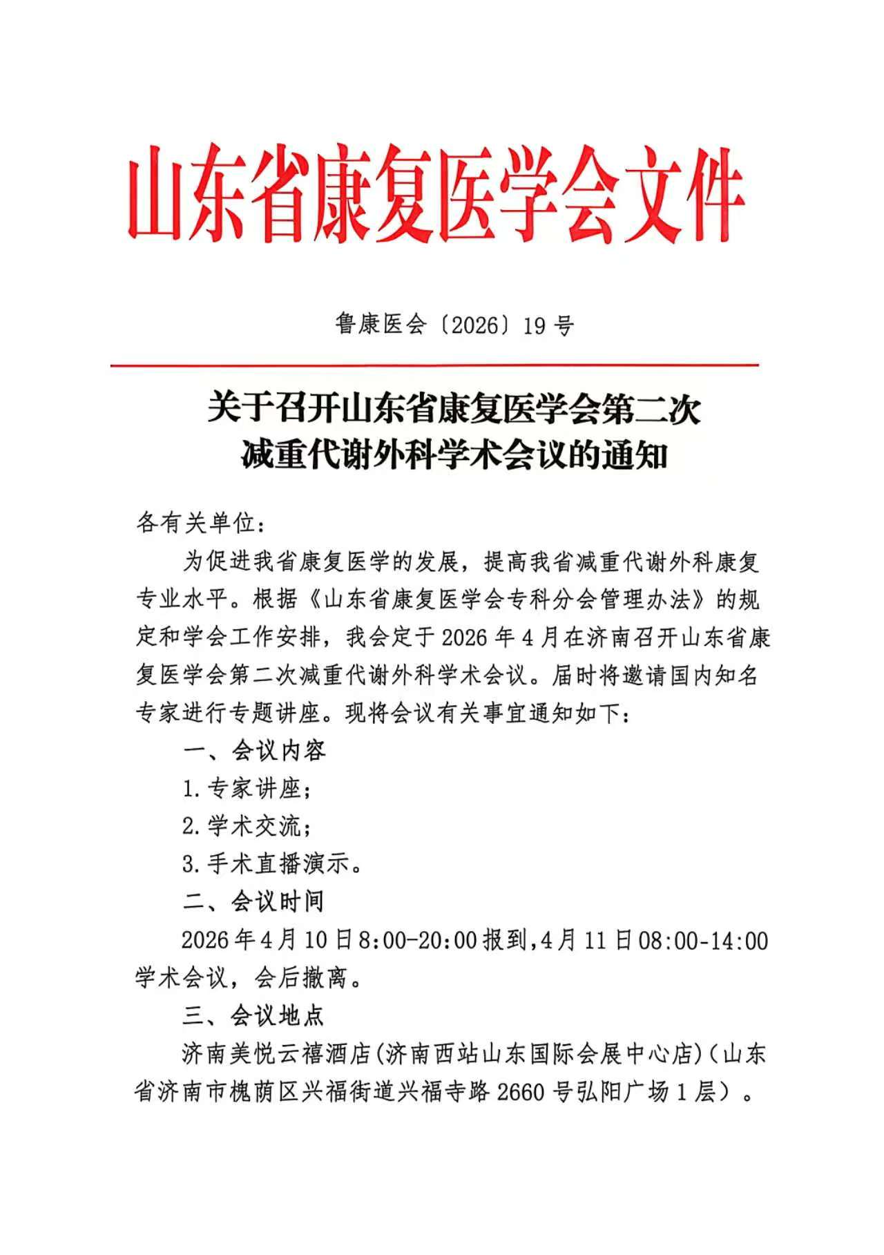 关于召开山东省康复医学会第二次减重代谢外科学术会议的通知