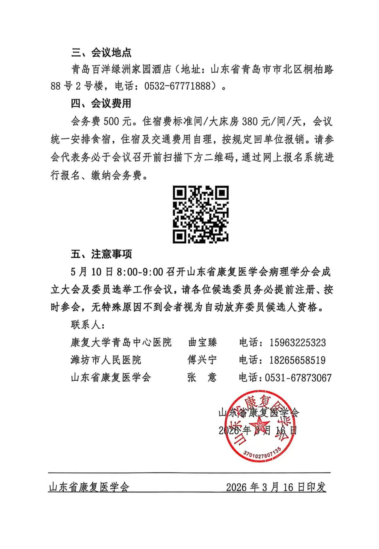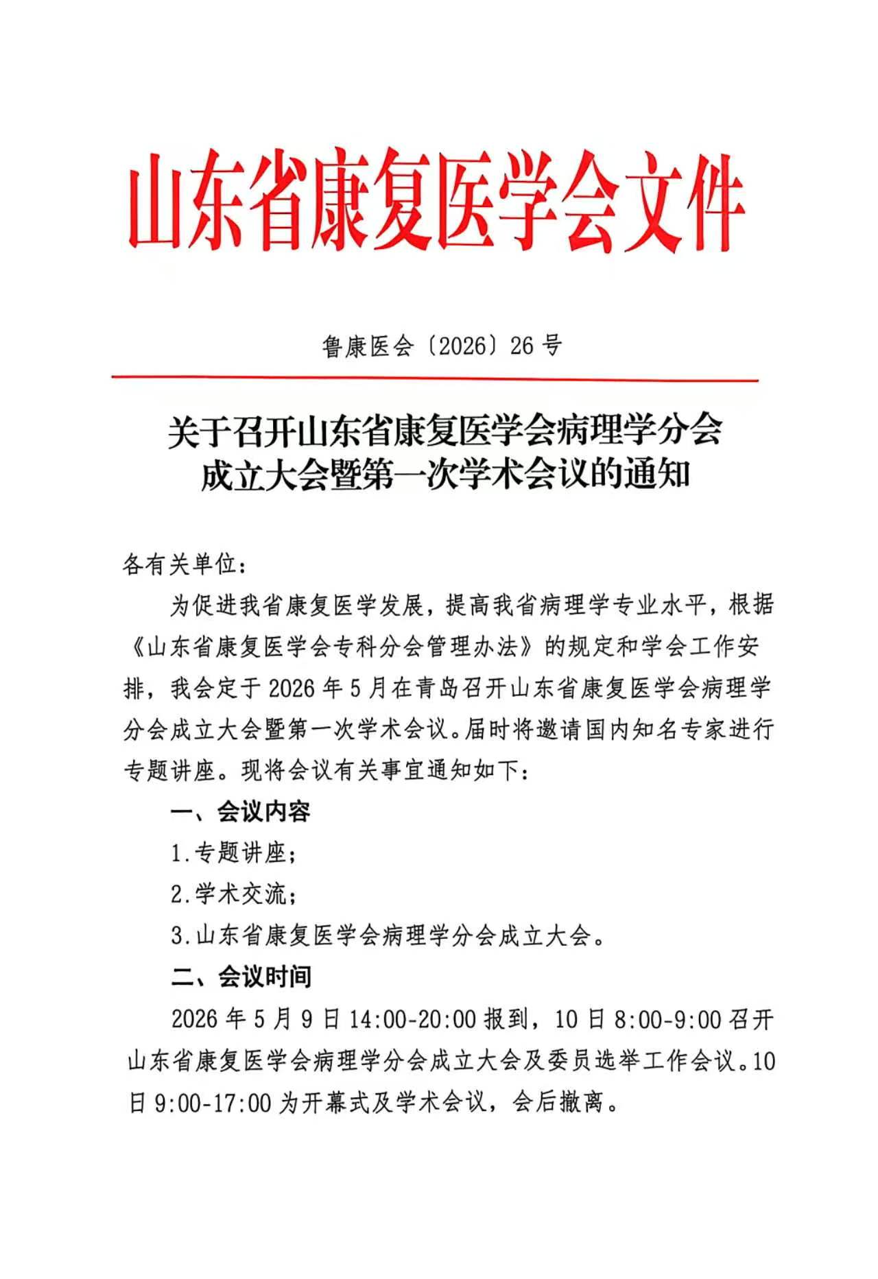 关于召开山东省康复医学会病理学分会成立大会暨第一次学术会议的通知