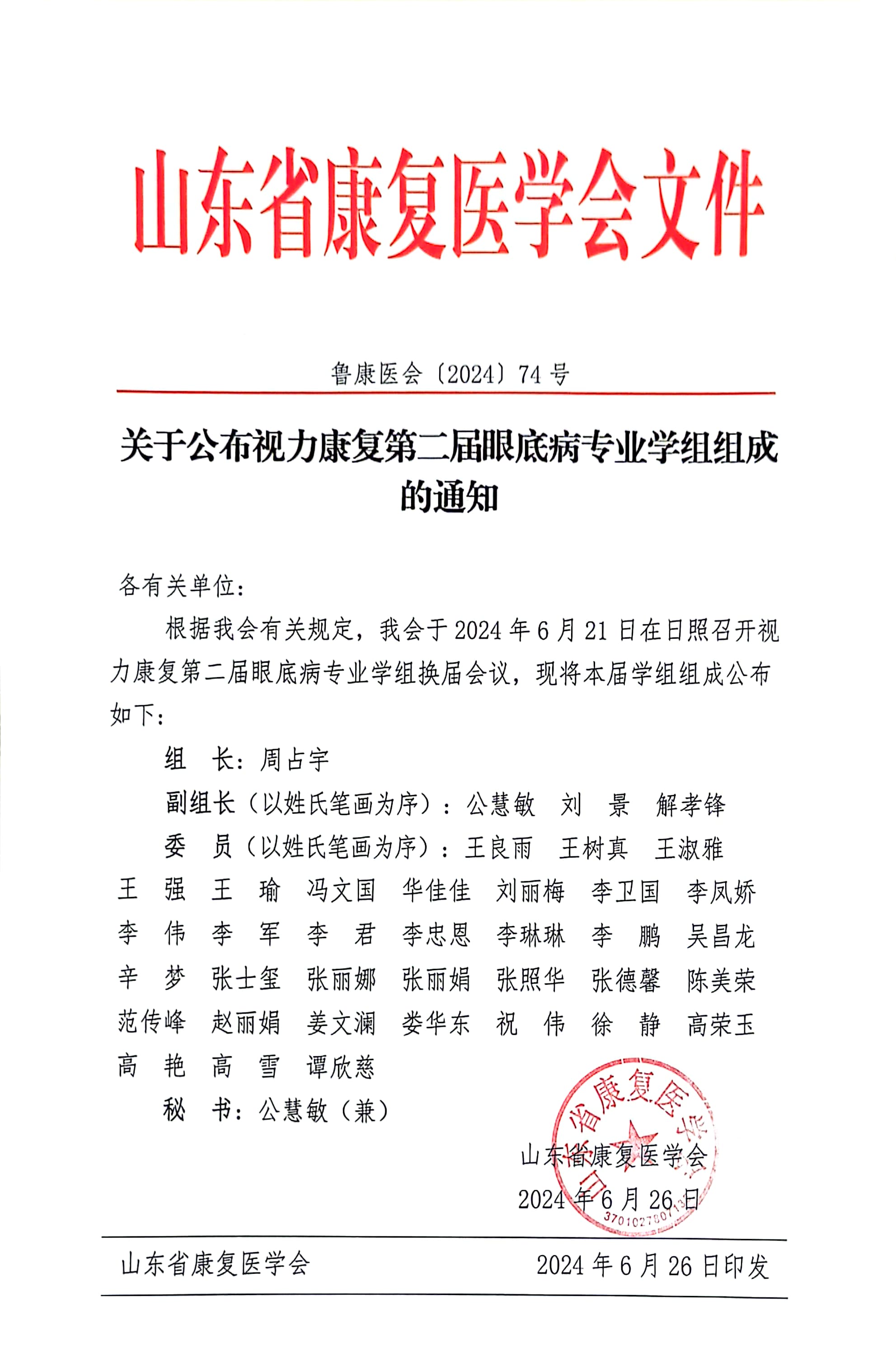 关于公布视力康复第二届眼底病专业学组组成的通知