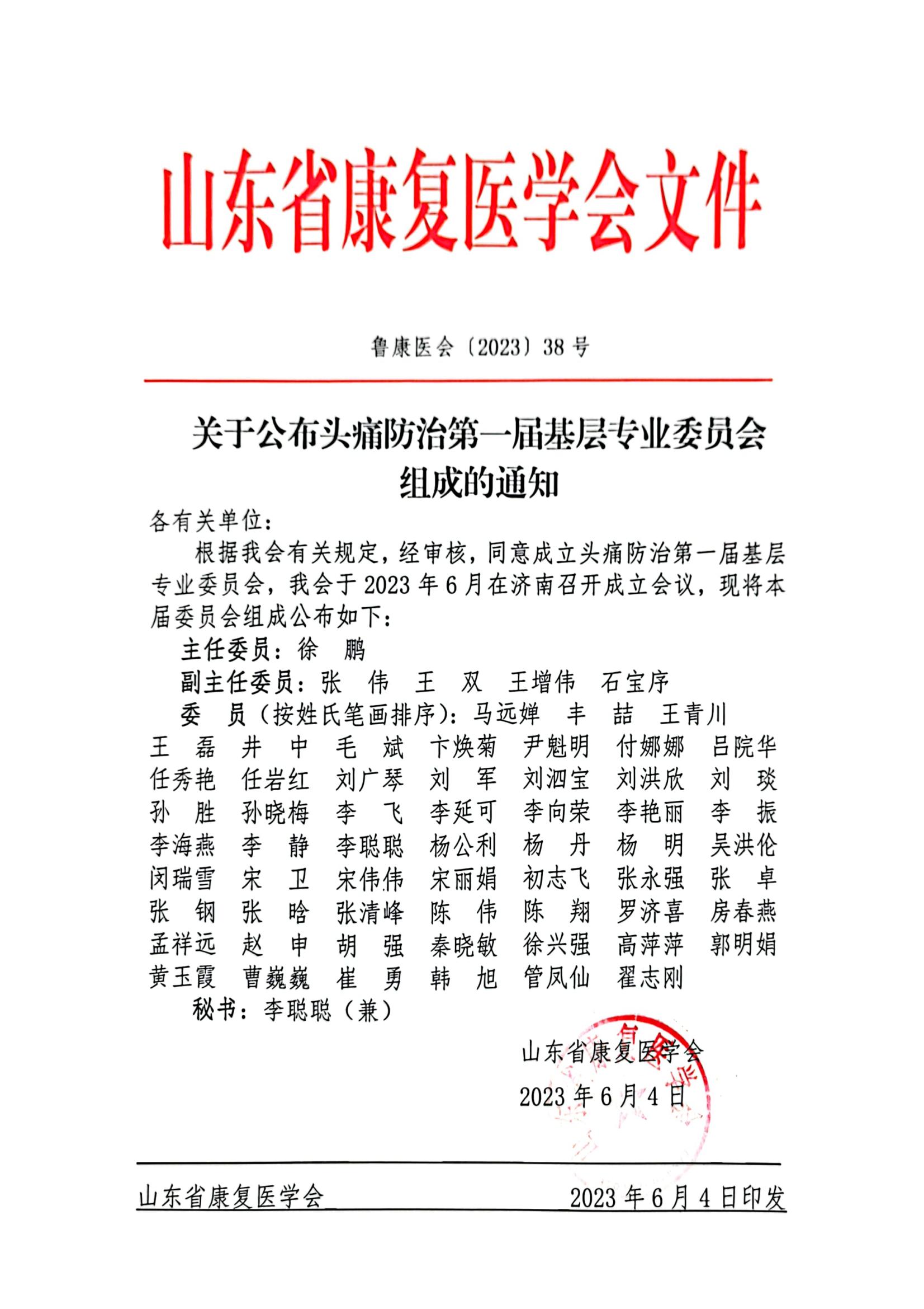 关于公布头痛防治第一届基层专业委员会组成的通知