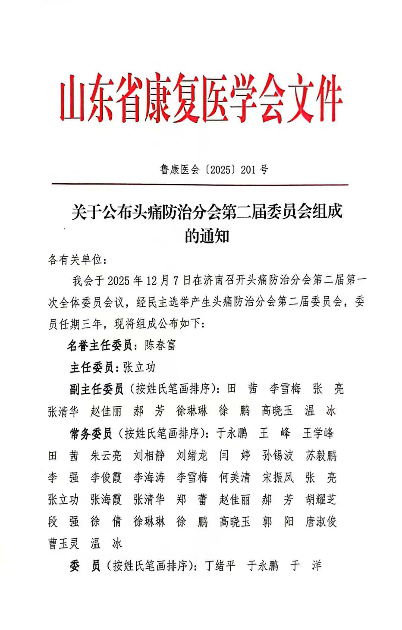 山东省康复医学会关于公布头痛防治分会第二届委员会组成的通知.pdf