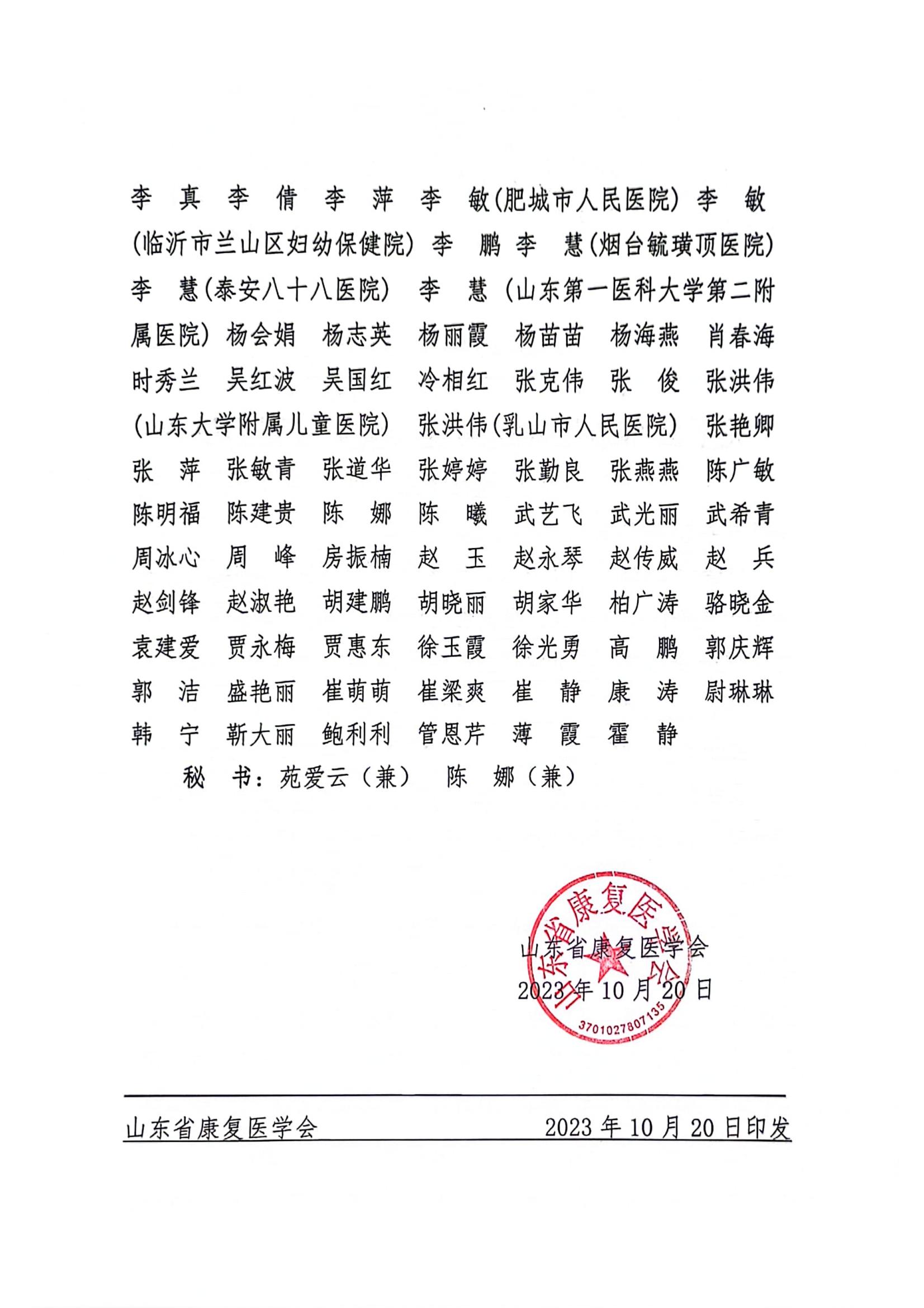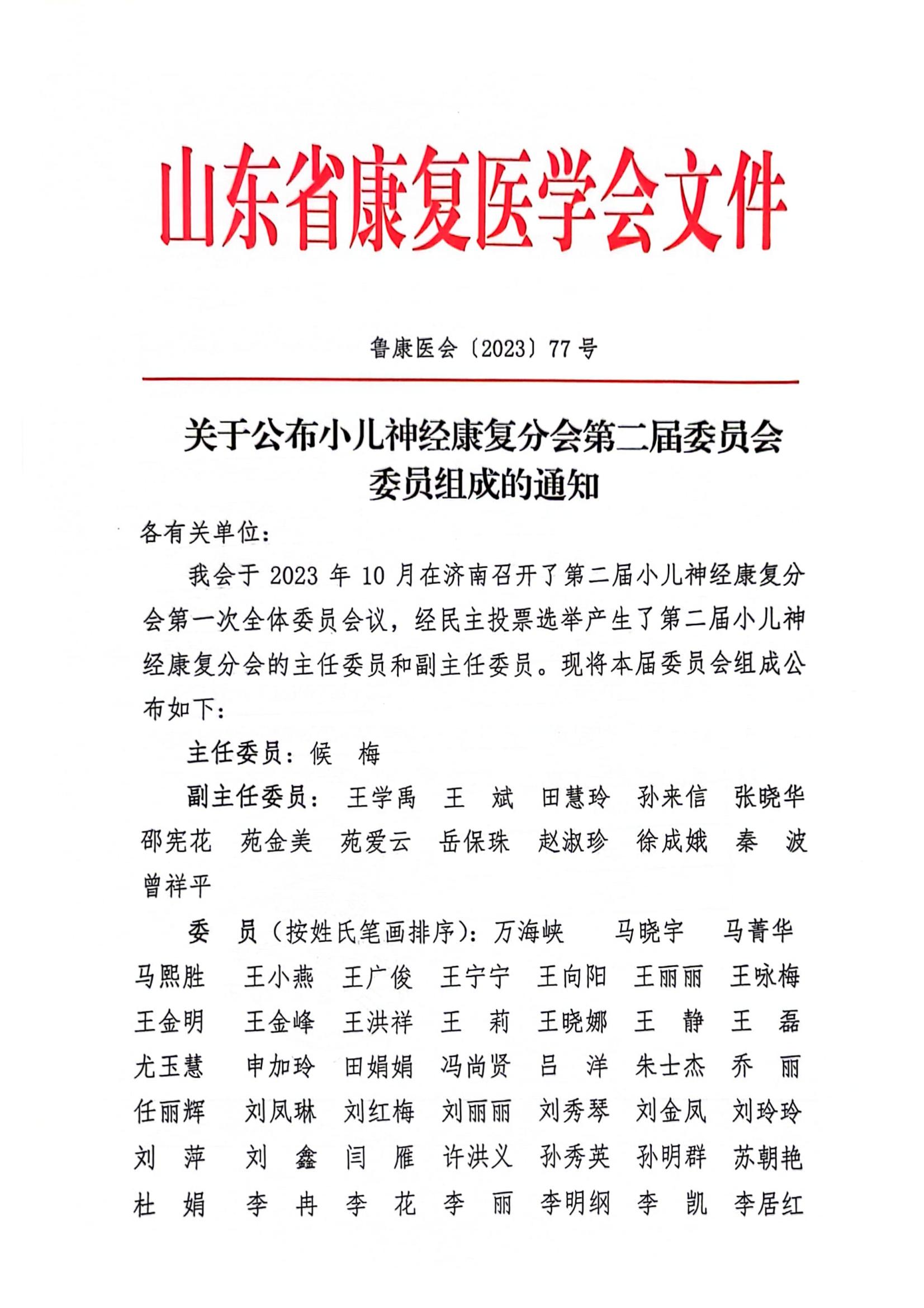 关于公布小儿神经康复分会第二届委员会委员组成的通知