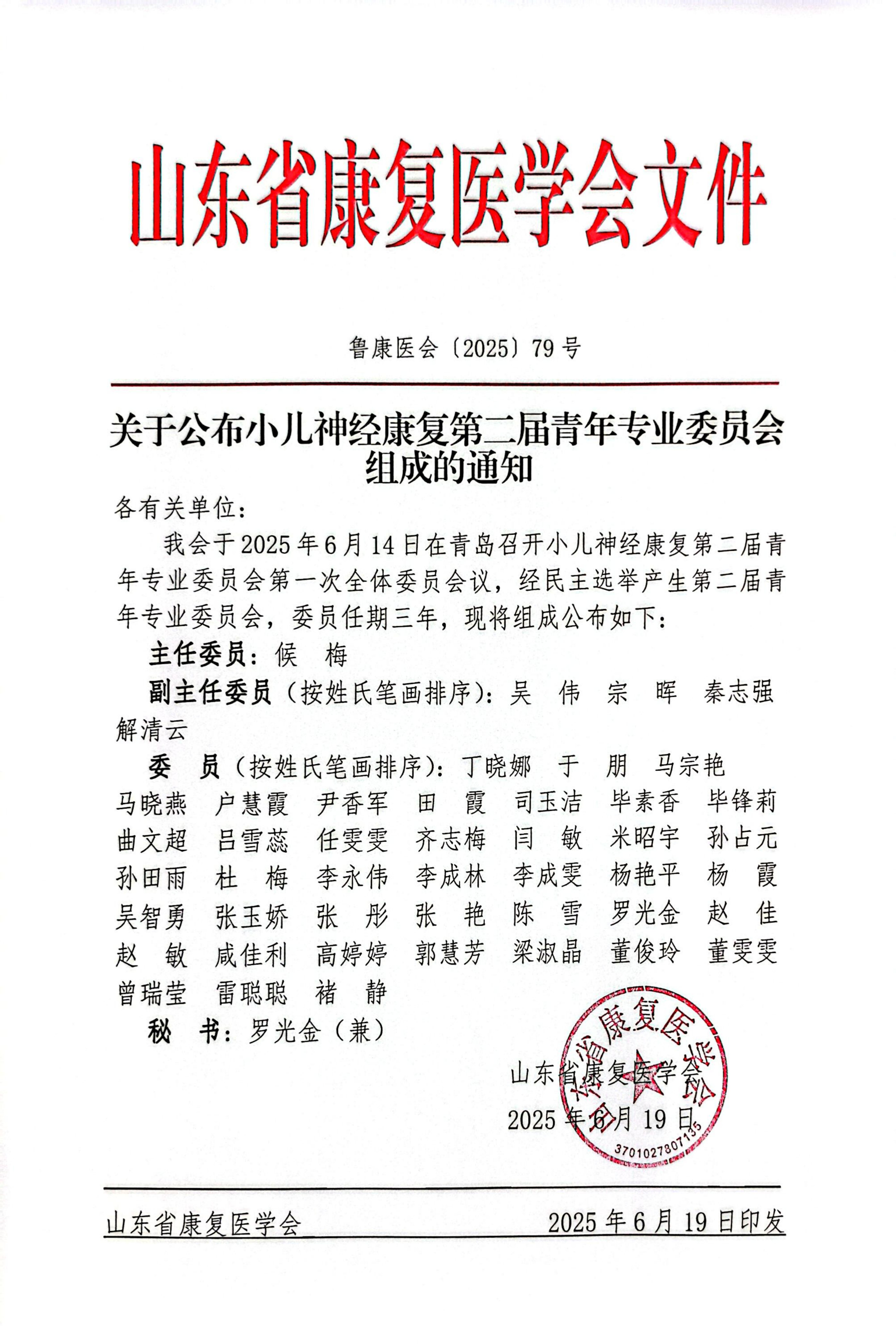 关于公布小儿神经康复第二届青年专业委员会组成的通知