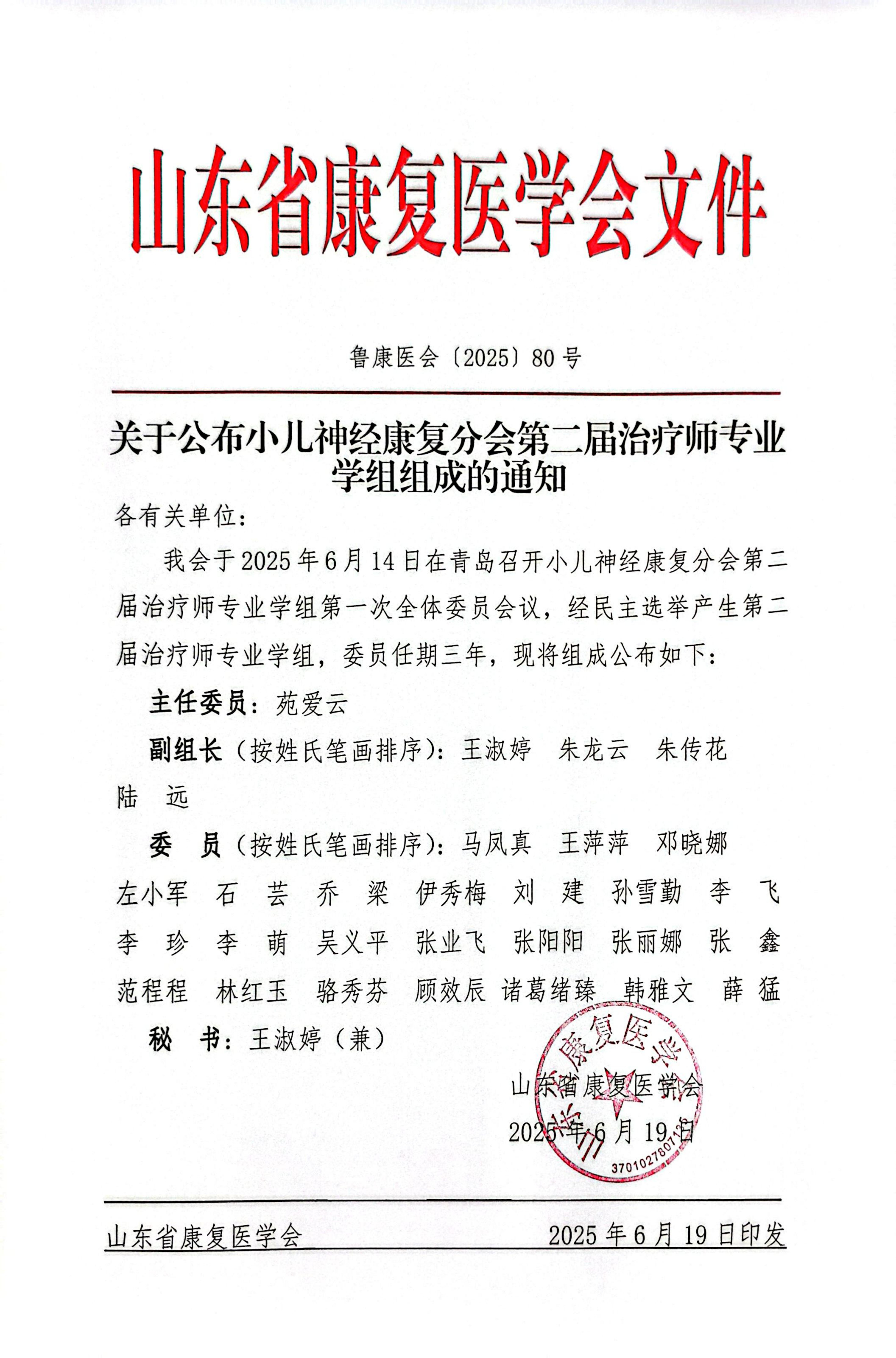 山东省康复医学会关于公布小儿神经康复分会第二届治疗师专业学组的组成.pdf