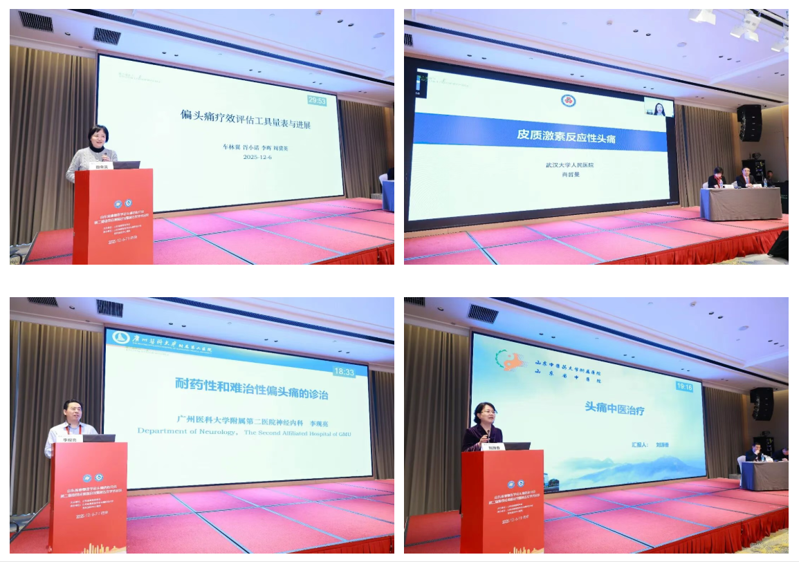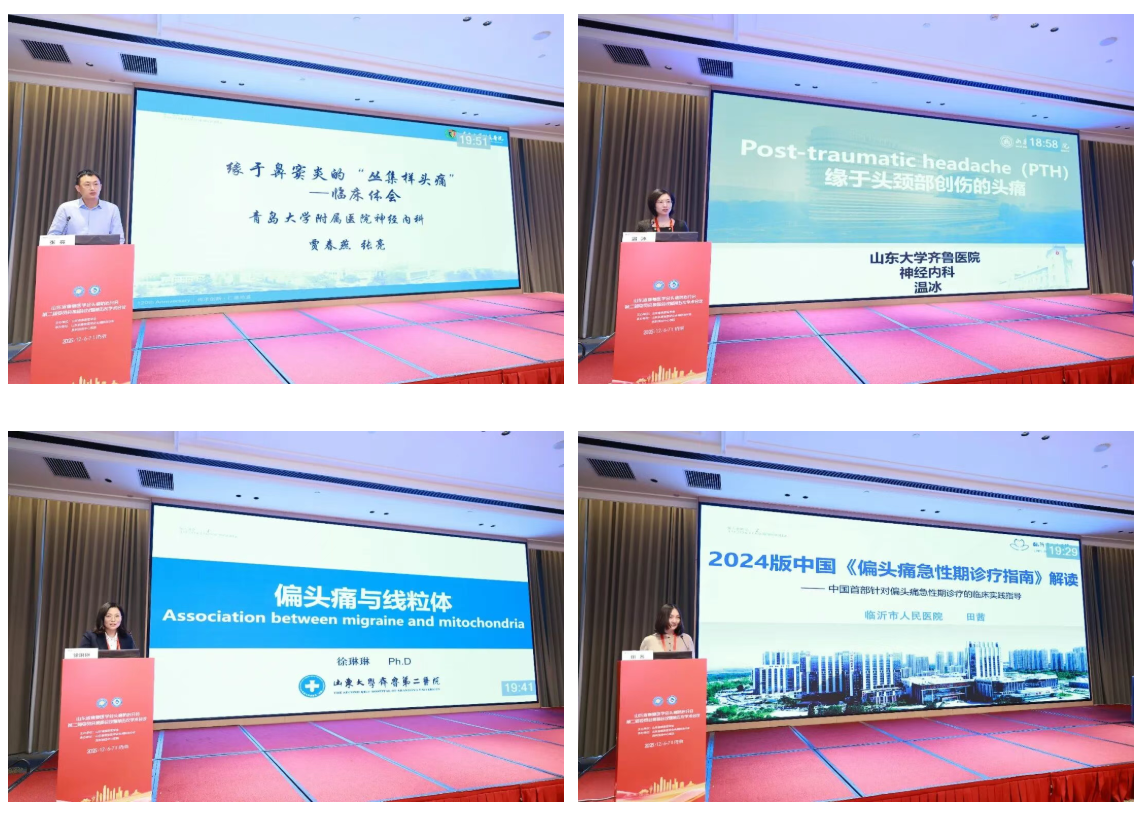 会议邀请了头痛防治领域的知名专家围绕相关热点、前沿技术和临床应用进行了深入的交流和探讨。本次会议内容丰富、形式多样,涵盖主题讲说,病例讨论等。现场学术氛围浓厚,讨论热烈,大家各抒己见,思想的碰撞激发出诸多创新火花。重庆医科大学附属第一医院周冀英教授分享了“偏头痛疗效评估工具量表与进展”;武汉大学人民医院肖哲曼教授就“皮质激素反应性头痛”进行了详细阐述;广州医科大学附属第二医院李现亮教授探讨了“耐药性和难治性偏头痛诊治进展”;山东大学齐鲁医院温冰教授介绍了“创伤后头痛”;青岛大学附属医院张亮教授以“缘于鼻窦炎的丛集样头痛”为题作了精彩报告;山东大学第二医院徐琳琳教授带来了“线粒体在头痛中的作用机制研究”;临沂市人民医院田茜教授进行了“偏头痛急性期治疗指南解读”;济宁医学院附属医院徐鹏教授分享了“药物过度使用性头痛诊治指南解读”;烟台毓璜顶医院高晓玉教授则以“化‘堵’为‘通’:耳源性静脉窦血栓的治疗”为题进行了分享;聊城市人民医院郝芳教授讲述了“偏头痛与肠道菌群的研究新展”;最后,山东第一医科大学附属省立医院赵佳丽教授以“偏头痛与青年卒中”这一精彩主题结束了学术研究环节。