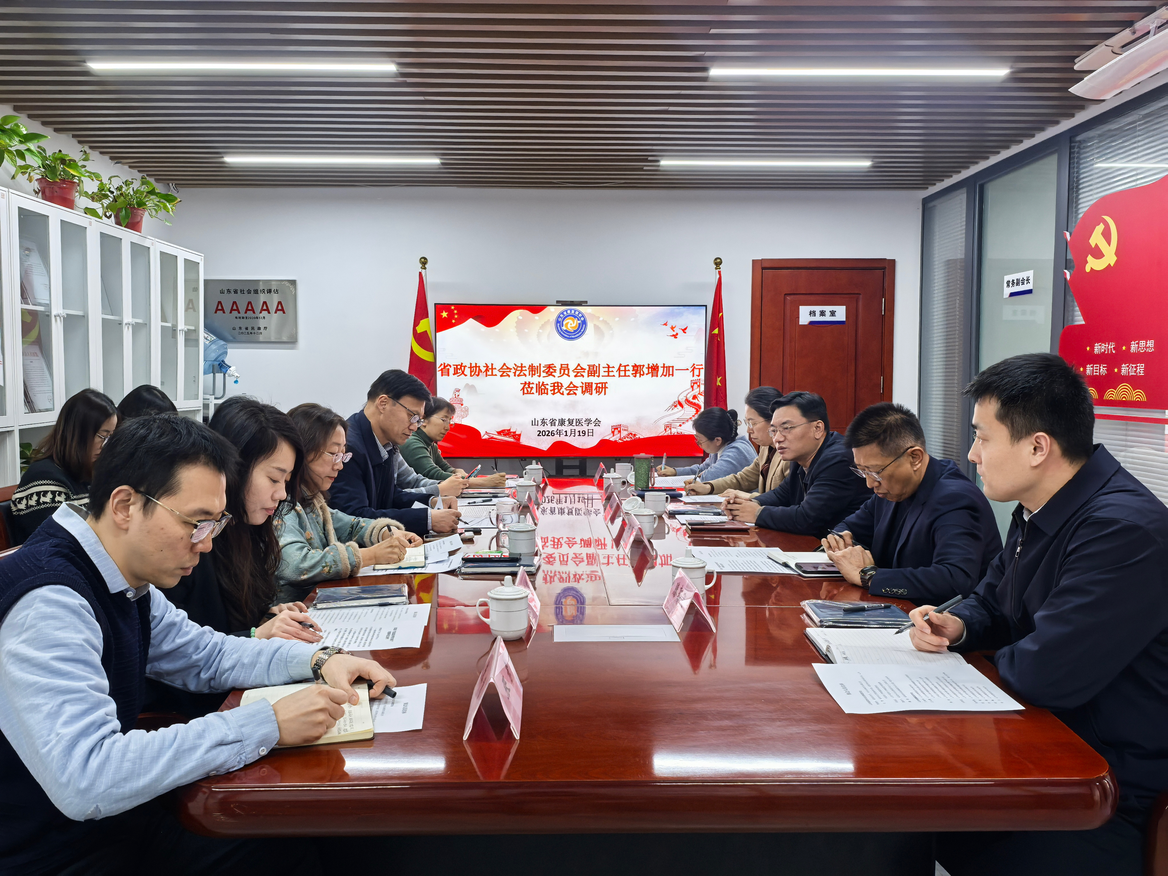 2026年1月19日,省政协委员、社会法制委员会副主任郭增加,省政协应用型智库专家任勇等一行5人莅临我会开展“推进康复护理扩容提升”专题调研座谈会。山东省康复医学会秘书长王绪华、脑血管病康复分会主任委员王永慧、康复护理分会主任委员陈欧、中西医结合分会主任委员刘西花、山东大学齐鲁医院重症康复病区护士长张秀英等参加座谈。