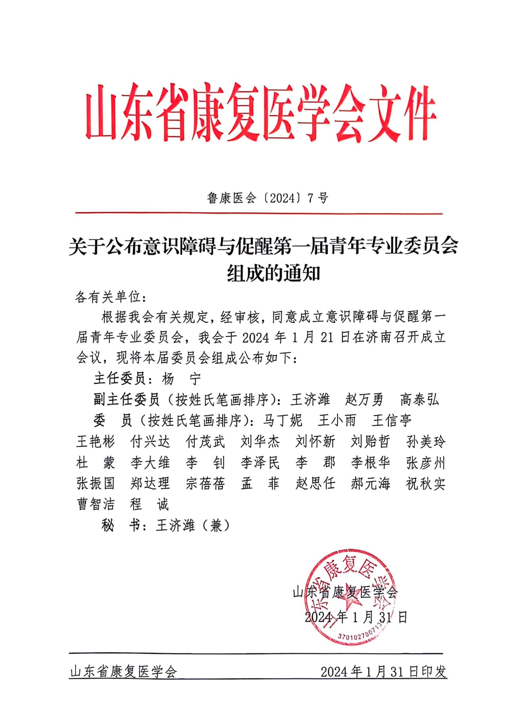 关于公布意识障碍与促醒第一届青年专业委员会组成的通知