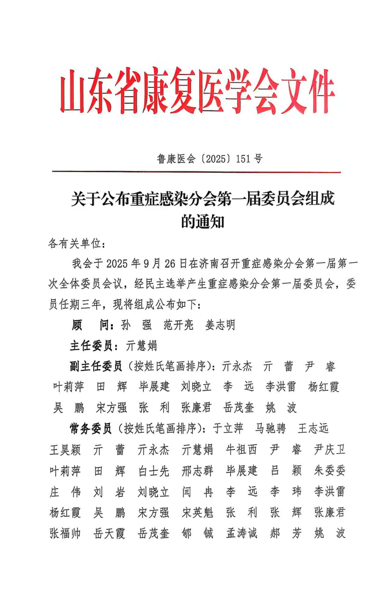 山东省康复医学会关于公布重症感染分会第一届委员会组成的通知.pdf